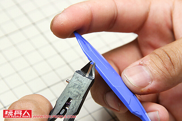 ▼ 再來才要針對剛剛留下的湯口,將斜口鉗貼平零件後完全剪平。