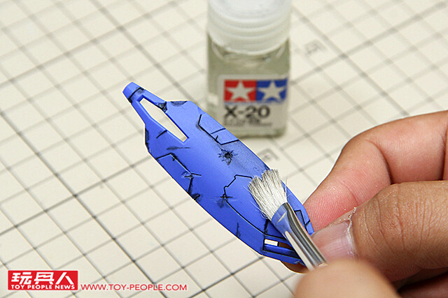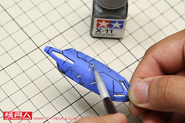 ▼ 接下來使用平塗筆沾取砝瑯漆溶劑,開始將剛才的墨線向下洗色,並且適當的保留些許砝瑯漆,模擬髒污感。