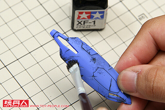 ▼ 完成洗色之後再拿出第二支平塗筆,使用黑色砝瑯漆進行乾掃,模擬細微的碰撞與刮傷。