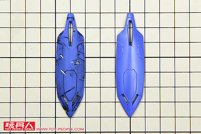 ▼ 比對一下原套件(右)與製作完成的零件(左),其實要製作出裝甲的表面損傷是非常容易的喔~