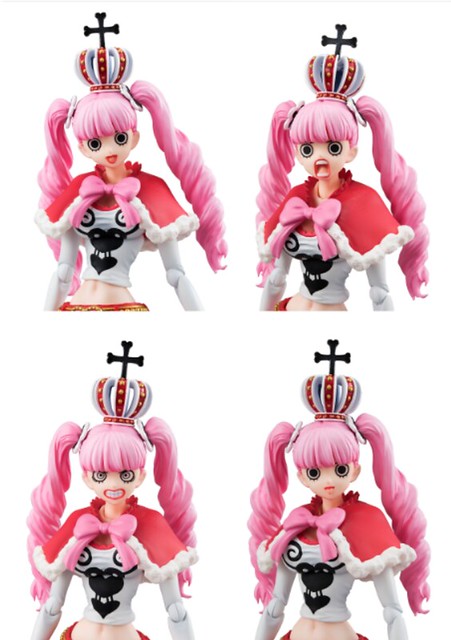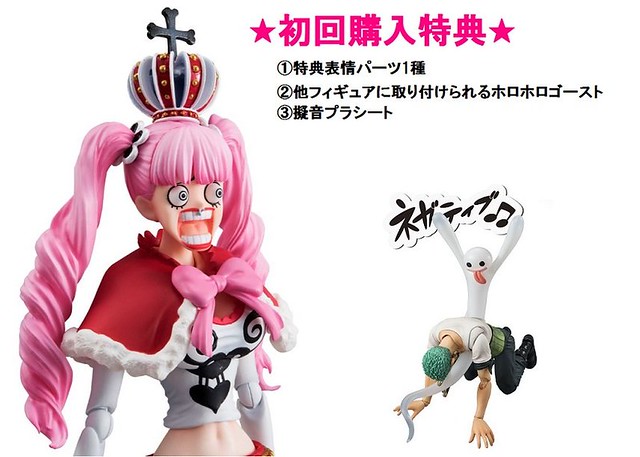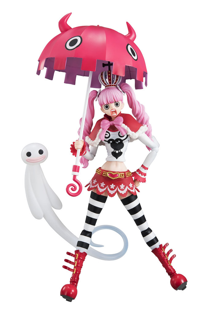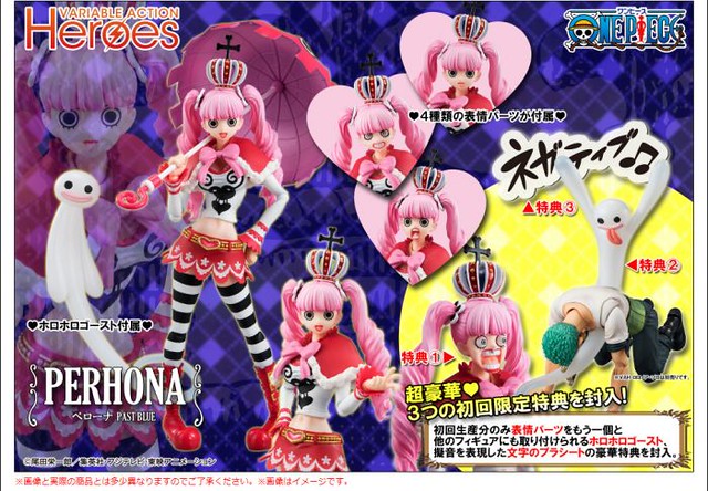 手上所持著惡魔尖角特殊造型的傘,綁著雙馬尾以及戴著后冠等等多處細節都完整呈現,並附有約四種不同表情配件可以替換,來表現培羅娜在故事裡面發生多種情境,這次將會收錄超豪華的三款"初回特典",有「特典驚訝顏部配件」、「鬼魂穿透特效配件」與「擬音文字配件」等等,喜愛《航海王》VARIABLE ACTION HEROES可動系列的玩具人千萬別錯過了啊!