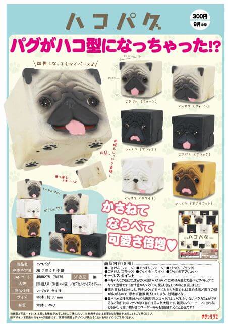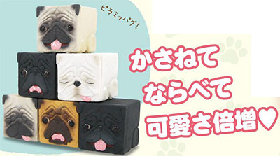 專門推出有趣味轉蛋尺寸作品的奇譚俱樂部,這次將以"巴哥犬"為題材來設計一款「方塊巴哥犬 (ハコパグ)」(名稱暫譯),日文「ハコ」是指"箱"容器的一種,"パグ"則是巴哥的發音,當然也可以翻譯成"箱巴哥犬"可能會更貼近日文,不是將巴哥犬的圖案直接印刷在方塊上面,則是將造型融入方塊(箱)之中,其中一款是"御機嫌(ごきげん)"是きげん的敬語,有"高興"、"好得很"的意思,將多個「方塊巴哥犬」推疊起來的模樣有種莫名的療癒感覺啊!