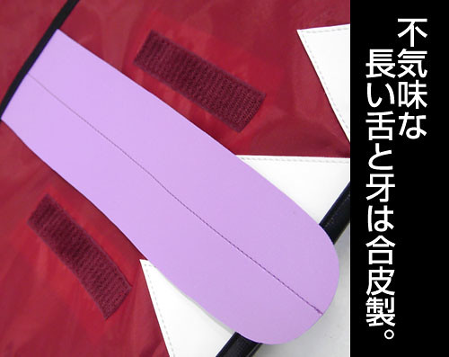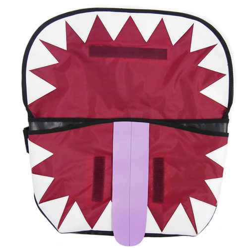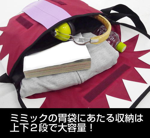 將郵差包打開後,寶箱怪的血盆大口與噁心的舌頭影映入眼簾,牙齒和舌頭部份使用合成皮製成,內部的紅色布料就好像寶箱怪的胃袋,雙層設計帶來大容量,還附有三個小物口袋。背包則透過魔鬼氈固定,就算讓寶箱怪吃胖一點也沒關係!