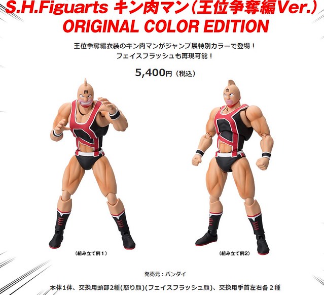 這次"ORIGINAL COLOR EDITION"將之前推出過藍紅配色的「王位争奪編ver.」更改為黑紅配色,這次週刊少年JUMP展場所販售的限定版本的配色真吸引《金肉人》粉絲們啊!作品並且附有兩種不同表情的頭雕配件可以替換,與交換用手首左右各2種、支撐架和底座等等配件,喜歡《金肉人》系列的玩具人千萬別錯過囉!