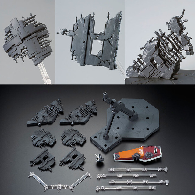 「MG 1/100 全裝甲型鋼彈 最終決戰Ver.」透過原本的KA版套件,將頭部、盾牌賦予全新的戰損表現,同時還附有大量「殖民地殘骸」場景零件與活動支架,與「腦波傳導型薩克 最終決戰Ver.」共同擺設就能將劇中最終決戰的場景精密再現!不過要注意的是,商品中唯一的武器只有光束軍刀,並沒有附上大型背包等配件。