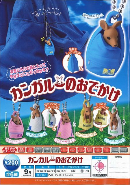 專門推出可愛療癒系轉蛋的EPOCH品牌,這次將以可愛動物"袋鼠"為題材來推出「旅行的袋鼠(カンガルーのおでかけ)」(名稱暫譯),把各式的背包、包巾與手提包等等"收納袋"結合在"袋鼠"身上,並且加上金屬吊鍊的設計,就變成可以攜帶著牠們一起外出的逗趣模樣,預計將推出約有六種類的「旅行的袋鼠」可以收集,對EPOCH所推出的動物轉蛋有興趣的玩具人可以參考一下歐!