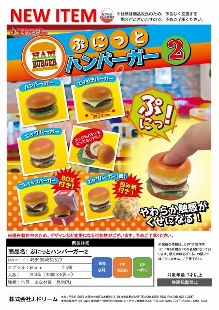 日本廠牌Jドリーム 使用最新的特殊軟Q材質所製作的逼真漢堡吊飾轉蛋「軟Q漢堡吊飾(ぷにっとハンバーガー)」,因應熱烈好評之後宣布再推第二彈,將推出更多不同口味的漢堡! 讓各位喜愛漢堡的吃貨們絕對不能錯過這次的新作啊!