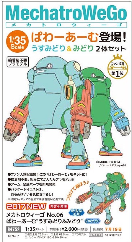 3DCG建模師也是原型師小林和史所設計的35機動機器人WeGo「35Mechatro WeGo」,相當受到喜愛機械題材的玩具人喜愛,之前由「長谷川」玩具公司所推出過的"1/35比例組裝模型"、"東雲研究所ver."與"光&黑影版本"都頗受模型玩具人們的歡迎,這次將繼續推出由人氣投票得"第1位"作品「機械動力手臂(ぱわーあーむ)」的版本。