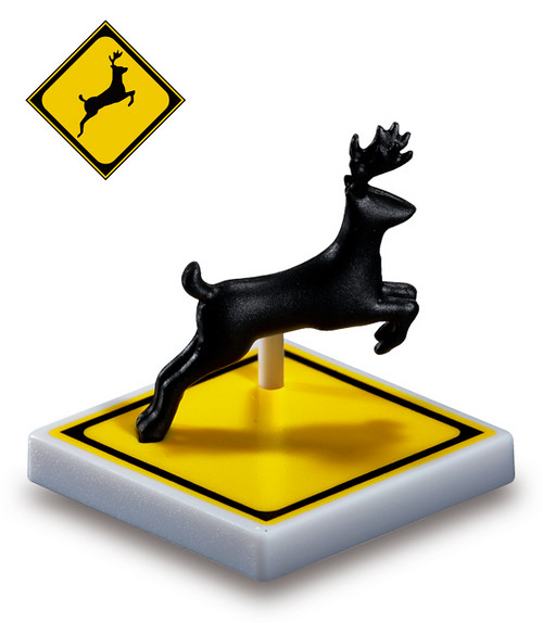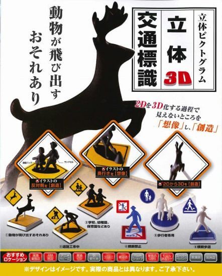 這次的「立體交通標識」預計將收錄日本街道旁的交通標識,其中一款「有一種可能性,動物會突然出現(動物が飛び出すおそれあり)」警告有鹿會突然飛出來,就直接將"鹿"製作成立體的模樣,還有注意兒童、禁止穿越馬路等等的交通標識上的平面人行,都把上面的人真正製作成立體的樣貌等等,喜愛創意轉蛋作品的玩具人可以參考一下歐!
