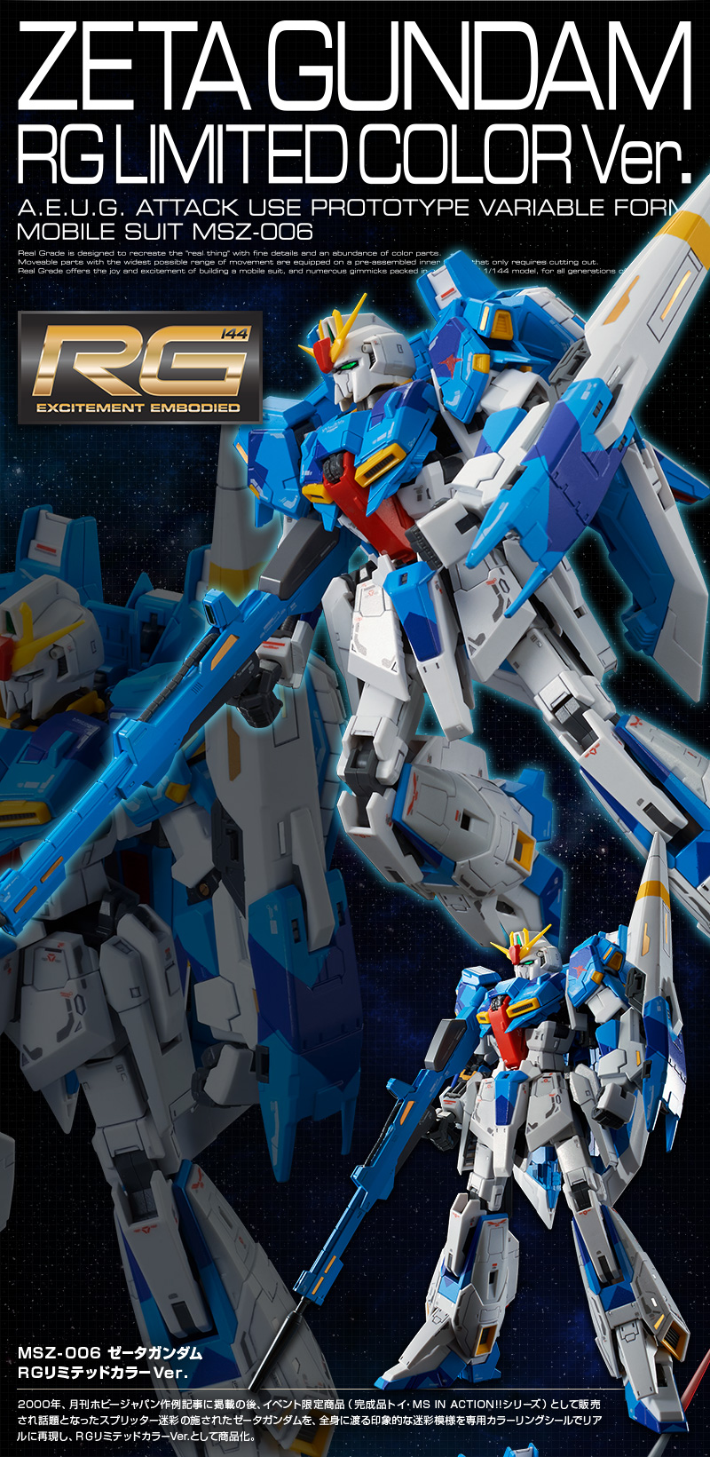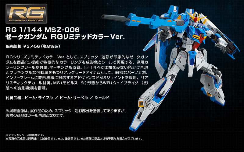 這次以2000年在綜合模型情報誌"Hobby JAPAN(月刊ホビージャパン)"發表過的"特殊配色版本Z鋼彈",這次把令人印象深刻的迷彩圖案成為此次「RG限定配色版本」,有著極其鮮豔又相當顯眼的藍色,機體一樣可以變型為WR飛行機體的狀態,作品將於魂web線上商店在2017年6月9日開始接受訂購,對《機動戰士鋼彈》系列有興趣的玩具人可以參考一下歐!