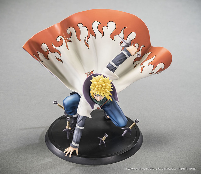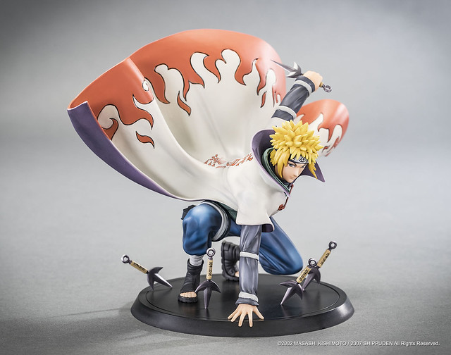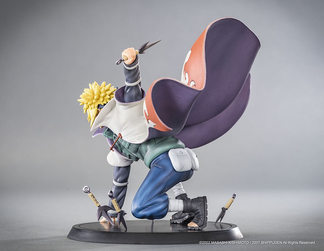 這次的作品正是以施展飛雷神之術為主題製作,充滿張力和動態感,四代火影披風尾端向上展開和飄揚的金色鬢角正顯示其速度感,身穿木葉忍者的標準服裝配備,加上落在地台的「特製苦無」讓完整性再提升!細節塗裝的表現更是精彩,凜然的表情、一頭金髮到服裝、披風各處細節等等,真的超有氣勢的啊~~