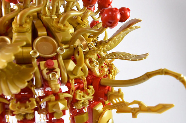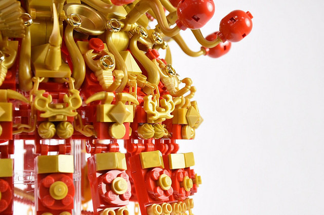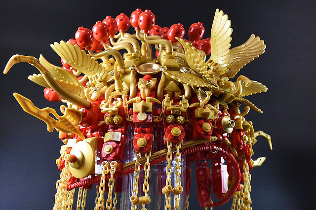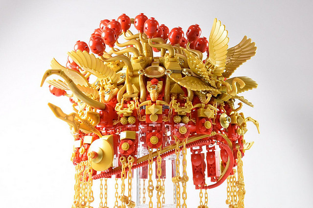 這帶有濃厚中國傳統文化的樂高新娘鳳冠來自Timothy Ng,他花了將近一個月的時間造就這驚人的作品,光是用金色的翅膀、鏈條,以及紅色的氣球勾勒出鳳冠華美的樣子,就已經讓小編相當佩服了~Timothy 更是在許多地方加了樂高金戒指、金色的菱形零件來裝飾,製造出鳳冠獨特的設計,也十分有畫龍點睛的效果喔!