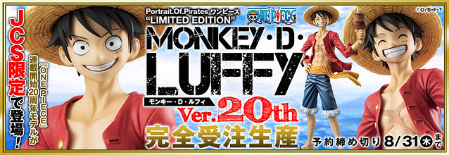 日本玩具品牌MegaHouse 公司旗下的「Portrait.Of.Pirates」(玩家簡稱為P.O.P)立體造型系列是地表最知名的《海賊王》收藏,為了慶祝《海賊王》連載20 週年除了推出P.O.P MAXIMUM 系列的魯夫4檔「彈跳人」外,也推出「20 週年的限定版魯夫」(LIMITED EDITION モンキー・D・ルフィ Ver.20th),預計2017年11月發售!!