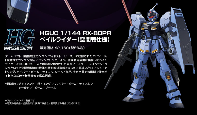 由日本BANDAI萬代玩具公司發行的眾多「鋼普拉」系列商品中,機體種類最為齊全並還原動畫中型象的「HG(High Grade)」系列這次將推出《機動戰士鋼彈外傳 MISSING LINK》蒼白騎士「空間戰版本」ペイルライダー(空間戦仕様)(名稱暫譯),於電玩遊戲《機動戰士鋼彈 SIDE STORIES》收錄的劇情"機動戰士鋼彈外傳 MISSING LINK"當中所登場,蒼白騎士機體是遊戲所原創MS機體之一。