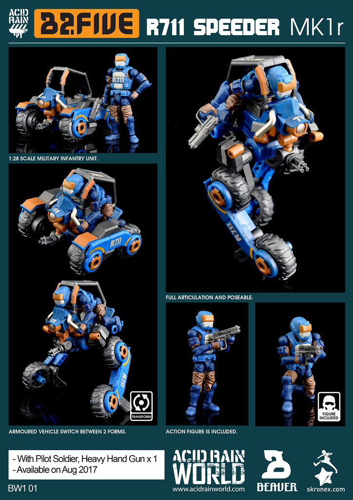 近年來大爆紅、全球擁有許多死忠粉絲熱烈支持的1/18 比例(3.75吋)《酸雨戰爭》系列作品,將與新廠牌BEAVER 合作推出新廠牌「B2FIVE」,將發行小巧尺寸、價格更加親民的1/28 比例(2.5吋)系列。 首波預計將於2017年8月推出四款作品:R711 SPEEDER MK1r、K6 JUNGLE SOLIDERS、K6 JUNGLE STRONGHOLD ST2K與88TH SAND DELUXE SET。