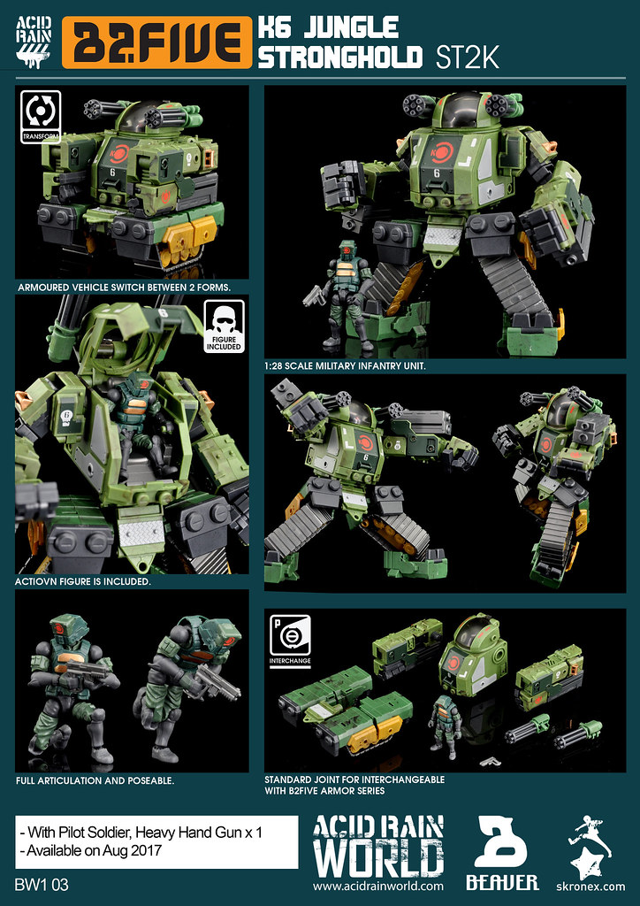 近年來大爆紅、全球擁有許多死忠粉絲熱烈支持的1/18 比例(3.75吋)《酸雨戰爭》系列作品,將與新廠牌BEAVER 合作推出新廠牌「B2FIVE」,將發行小巧尺寸、價格更加親民的1/28 比例(2.5吋)系列。 首波預計將於2017年8月推出四款作品:R711SPEEDER MK1r、K6 JUNGLE SOLIDERS、K6 JUNGLE STRONGHOLD ST2K與88TH SAND DELUXE SET。