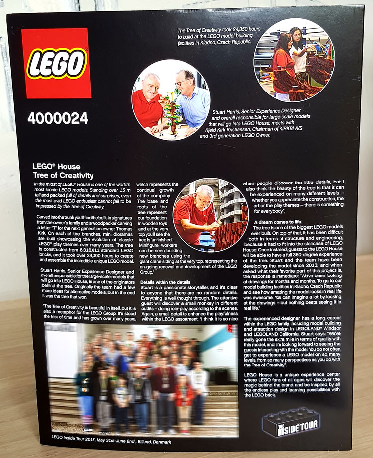 這創意之樹來自於位於丹麥比隆的「Lego House」樂高體驗中心,玩家們可以把它想成一種新型的樂高樂園,有樂高廣場、商店、餐廳、還有關於樂高歷史的介紹區域等等,有些區域可免費體驗;「創意之樹」正是位於Lego House 的一樓中心位置,是一座重達20 公噸(含金屬骨架)、高達15 公尺的龐然大物,零件超過630 萬個樂高,真是太瘋狂了!這次的Lego 4000024 正是這壯觀作品縮小版。