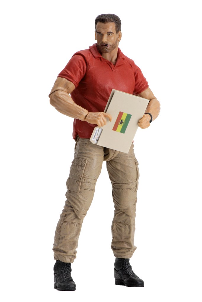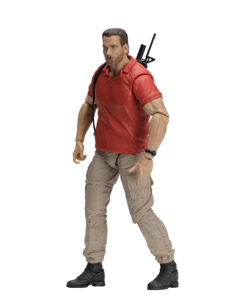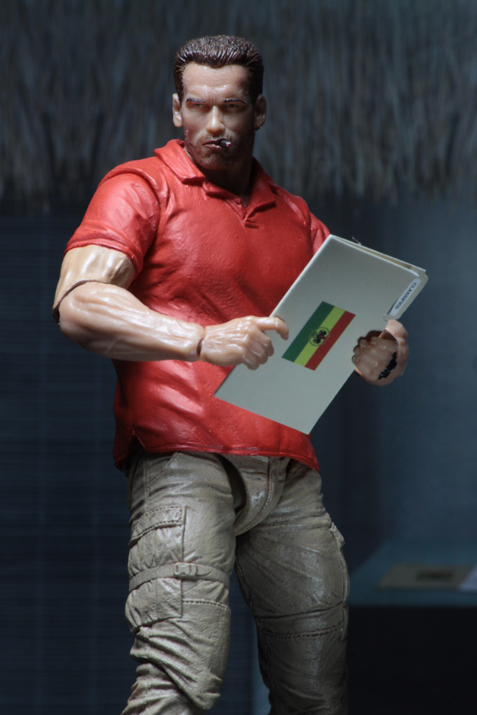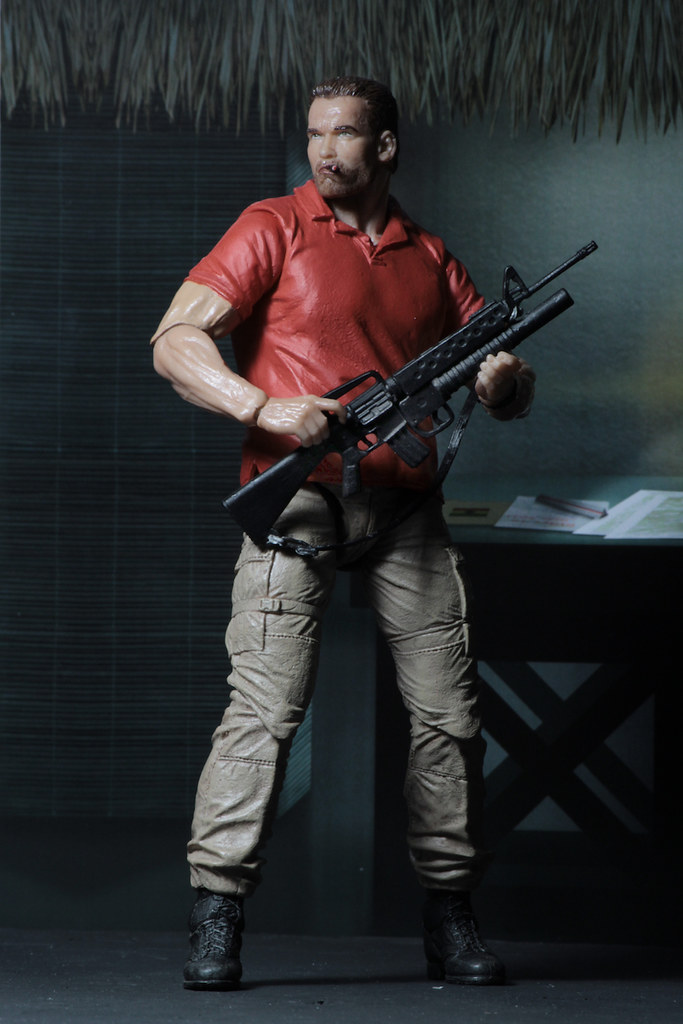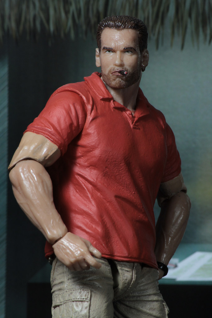 這次的作品是NECA 為了紀念《終極戰士》滿30 週年所推出,把道奇少校在片頭出現的形象完整還原,相信看到這紅色POLO 衫的造型,各位玩具人一定都還記得當時從直升機下來的阿諾有多帥氣吧~叼著雪茄、一副跩跩的樣子真的很經典!這套服裝在《終極戰士》裡就出現這麼一下下,是與將軍、舊友狄倫(Dillon)討論任務細節時的造型。