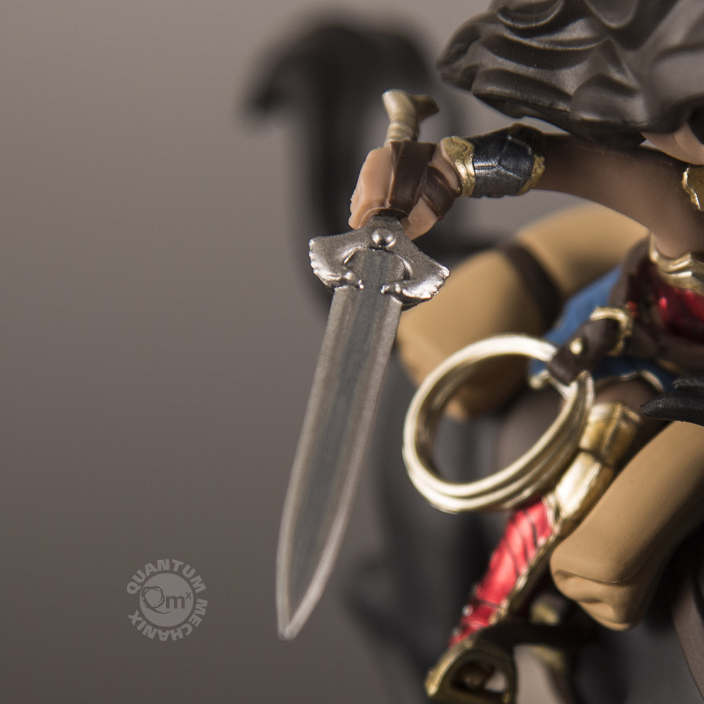這次Quantum Mechanix Inc. 公司所要推出的「神力女超人」Q 版作品,採用騎在一匹黑色馬上狂奔的姿態呈現。在臉部的表情相當凝重看著前方目標的感覺,其左手握緊著馬的韁繩、右手拿著「弒魂者」(God Killer)的寶劍、腰間栓著「真言套索」(Lasso of Truth),搭配全身金、藍、紅色的盔甲裝束,實在是太讚了!絕對是女神粉最棒的收藏之一啊~~