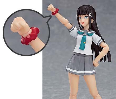 還有「書包」、動畫第3話裡面停電時準備的「發電機」與劇中令人印象深刻的「扇子」,以及片尾ED出現的場景「替換用赤腳零件」與角色代表色的「啦啦隊彩球」,與支援各種場景的附可動支架figma專用台座,部份裙襬使用著軟性材質來確保人偶的平衡與可動性,讓玩家可以輕鬆擺放出劇中的各種姿勢場景等等,另外於GOODSMILE線上商店訂購此作將多附有特典"髮圈"配件,喜愛《Lovelive!Sunshine!!》系列作品的玩具人可以參考一下歐!
