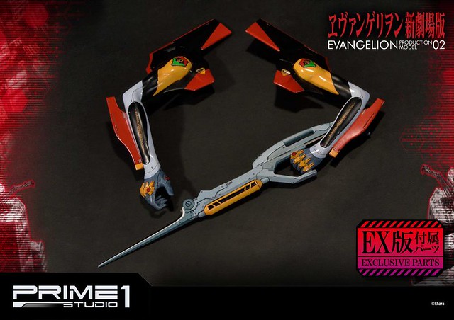 Prime 1 Studio 推出的貳號機高達73.7 公分,將貳號機在第3新東京市作戰的震撼場面,以極為細膩的雕刻、塗裝技術高度立體化!在武器部分非常地豪華,採用與手相連的方式,包含兩把高振動粒子刀、雙槍(附有攻擊的特效零件),EX 版還附有超強的「THUNDER SPEAR」,再加上原本的手部零件可以做出非常多種變化啊~再加上精細的地台,看起來窮途末路的車輛、毀壞的大樓等元素讓作品更加完整,真的福音戰士迷是夢幻收藏品啊!!