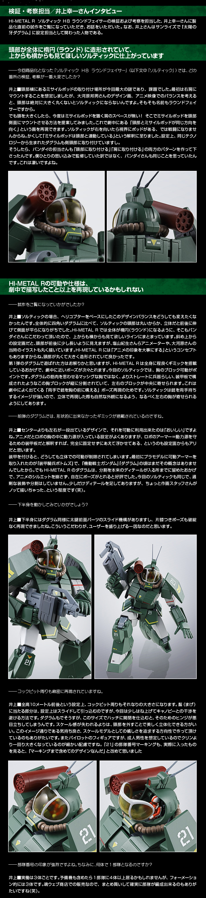 此次相當考究動畫當中的設定,無論是在外觀造型與機體結構和可動關節等等,並且還請到原《太陽之牙》設定「井上幸一」老師來檢證、考察擔當這次的Hi-METAL R可動作品,駕駛艙可以開啟呈現劇中人員進入的模樣,此作附有交換用右手首2種、交換用左手首3種、武器槍、魂STAGE用支撐架與底座等等多款配件,預計於魂web線上商店在2017年6月23日開始接受訂購,喜歡《太陽之牙》動畫作品的玩具人可以參考一下歐!