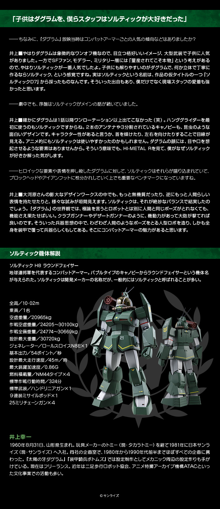 日BANDAI萬代玩具公司的Hi-METAL R可動系列以《太陽之牙 達格拉姆》動畫作品為題材,繼推出過游擊隊戰鬥機體「達格拉姆」後,將繼續推出「索爾迪克 H8 蘭德菲薩(ソルティック H8 ラウンドフェイサー)」的戰鬥機體,在動畫裡面是地球連邦軍的主力機體有著很長的名稱「索爾迪克 H8 蘭德菲薩」。