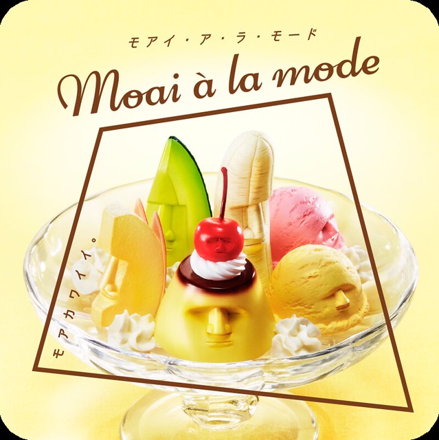 真的太佩服這個品牌了,之前的猩猩臉(顔ゴリラ)已經讓小編笑得無法自拔,結果現在又以超人氣石像「摩艾像」(Moai)為題結合夏天必吃的冰甜品,打造出讓人無論如何都吃不下去的「摩艾像冰品」!可以看到有布丁(上面有櫻桃)、哈密瓜、香蕉、蘋果、兩球冰淇淋等款式,原本明明超可口的甜品配上摩艾像的臉,這....這實在太欠揍了啊啊~尤其是那顆紅潤小巧的櫻桃,塞進摩艾像的臉造成的超萌反差真的太療癒了!完全是整套必收的節奏~