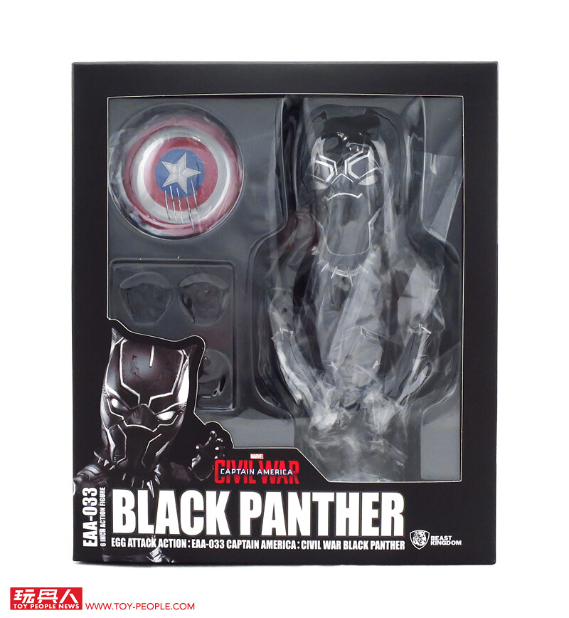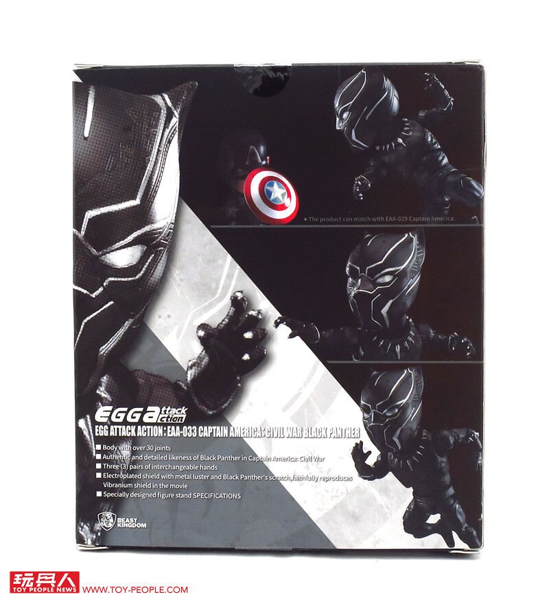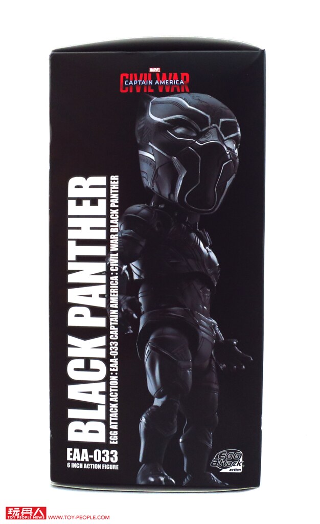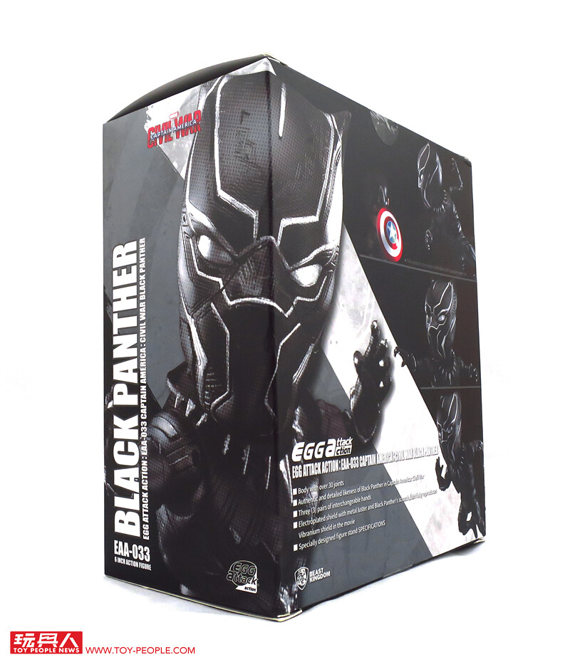 本名帝查拉(T’Challa)的黑豹,在簽訂蘇科維亞協議的會議現場目賭父親帝查卡(T’Chaka)遇害身亡,在悲痛之餘接下了瓦坎達國王的重擔,同時也繼承了「黑豹」的名號,誓言血債血還的他穿上了由釩合金特製的黑豹戰甲,出現在酷寒戰士巴奇和美國隊長面前,而後更與以鋼鐵人為首的註冊派一同行動,在萊比錫哈雷機場與美國隊長為首的反註冊派展開一場驚險無比的英雄內戰,本次開箱報告要分享的,正是來自《英雄內戰》中的Egg Attack Action第33號-黑豹!