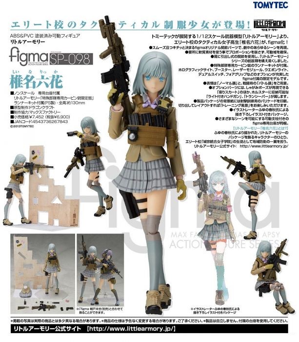 專門製作鐵道模型的日廠tomytec公司,旗下的"LittleArmory品牌"以約1/12比例尺寸來推出軍事相關的作品相當受到歡迎,這次與Maxfactory公司合作將推出的figma可動系列的「椎名六花」,有著一身高中制服造型的椎名六花,是由ふゆの春秋所描繪於LittleArmory系列外包裝上的其中一位角色,設定上以菁英學校「城宗統合女子學院」學生的身分擔任地區防衛的任務。