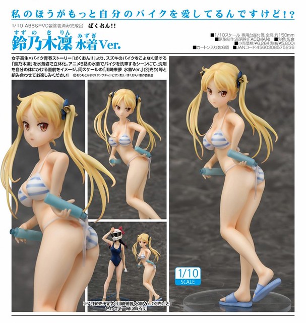 主打高品質美少女模型的日本 Phat!公司(株式会社 ファット・カンパニー),這次以女高中生×機車的青春物語『爆音少女!!』為題材,並以特別熱愛鈴木機車的「鈴乃木凜」以泳裝造型來呈現,出自動畫第5話當中她穿著泳裝洗機車的時候,將清潔劑往自己身上擠的經典畫面,將身材姣好的她常綁著雙馬尾造型都完整再現,喜愛《爆音少女!!》系列的玩具人千萬別錯過了啊!
