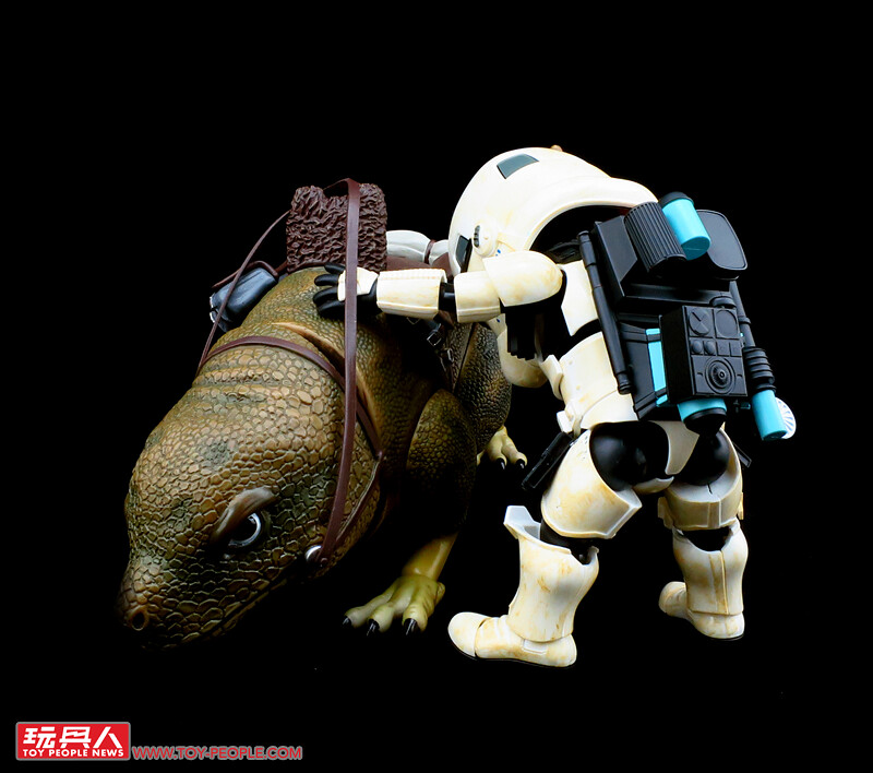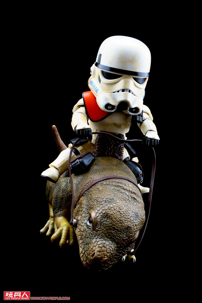 除了系列作一貫的六吋大頭人偶比例,沙漠兵長年在大漠的鎧甲舊化當然也不可或缺,全身上下的特殊舊化處理讓人彷彿置身飛沙走石之中,而前作附屬的武裝,包括了帝國白兵基本的E-11爆能步槍、沙漠兵專屬的T-21輕型連發步槍及SD-48生存背包也均收錄其中,同時也附上了指揮官特有的橘色護肩可供替換,而本款最大的特色,當然還是沙漠兵特有的坐騎-溼背獸(Dewback)啦!~