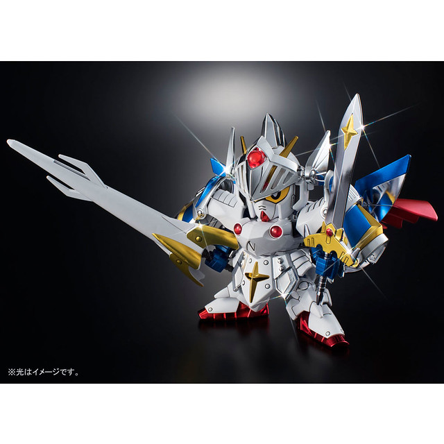 在一般的版本中,「BB戰士 LEGENDBB 萬能騎士鋼彈」的部份鎧甲就已有金、銀的電鍍上色,而這次的「電鍍版」中,鎧甲、嘴部、足部等處都分別追加了金屬藍成形與紅色電鍍,寶劍、翅膀部份也新增了具有金屬質感的銀色電鍍,臉、鎧甲、電磁長槍則是以光澤射出成形表現純白的色澤,整體散發出過去沒有的全新光輝!