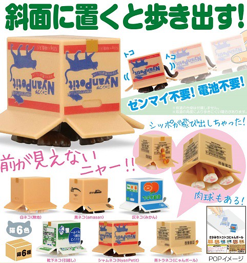 「さかみちトコトコ」系列,是利用了特殊的構造設計,讓機關在斜坡時能藉由向下的力量而做出搖搖晃晃的的行走動作。 繼第一彈生動詮釋搖晃小碎步的「行走企鵝」之後,第二彈將以「紙箱貓(にゃんボール)」為主題登場! 頭頂著紙箱的貓咪們完全看不到四周,因而也踩踏著奇怪的步伐;全套將以六種不同圖樣的紙箱搭配不同花色的貓兒,並且還挖了尾巴的孔露出尾巴、最受貓迷喜愛的腳底肉球也完全忠實呈現!:D