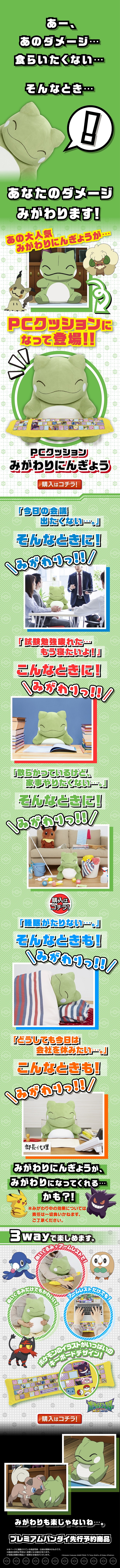 「PC CUSHION 替身娃娃」的玩偶本體約 45 公分高,圓圓又可愛的身體剛好能塞滿你的懷抱。兩隻手縫有魔鬼氈,能和鍵盤造型的手靠墊結合,減輕打字時手臂的壓力,並印有可愛的寶可夢圖樣!當你忙得不可開交或是想偷懶時也可以使用「替身」,將替身娃娃當成你的分身!不過不保證會有效果喔XD