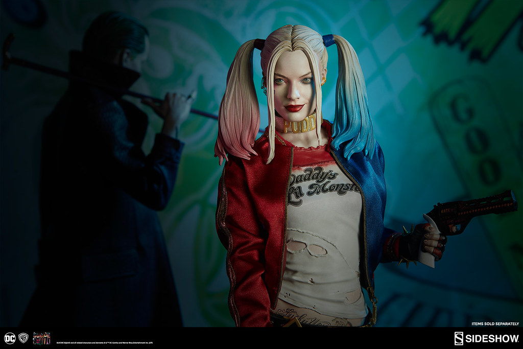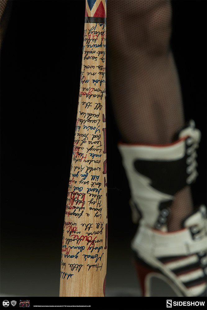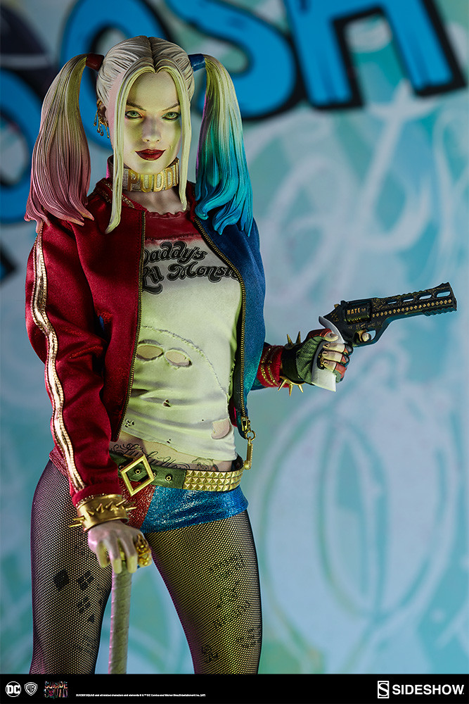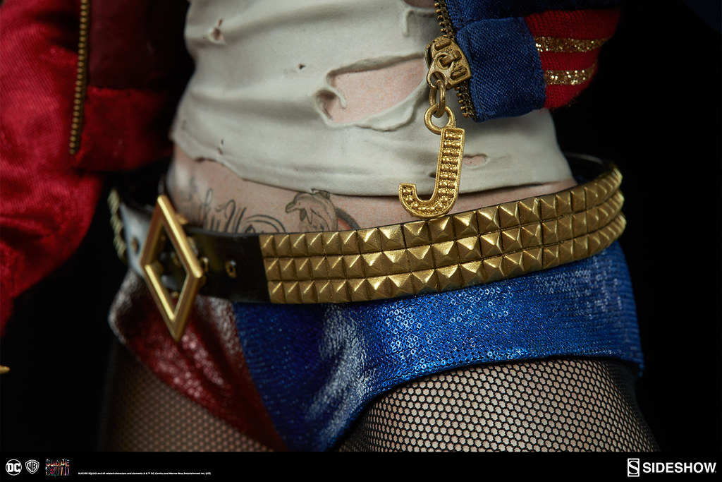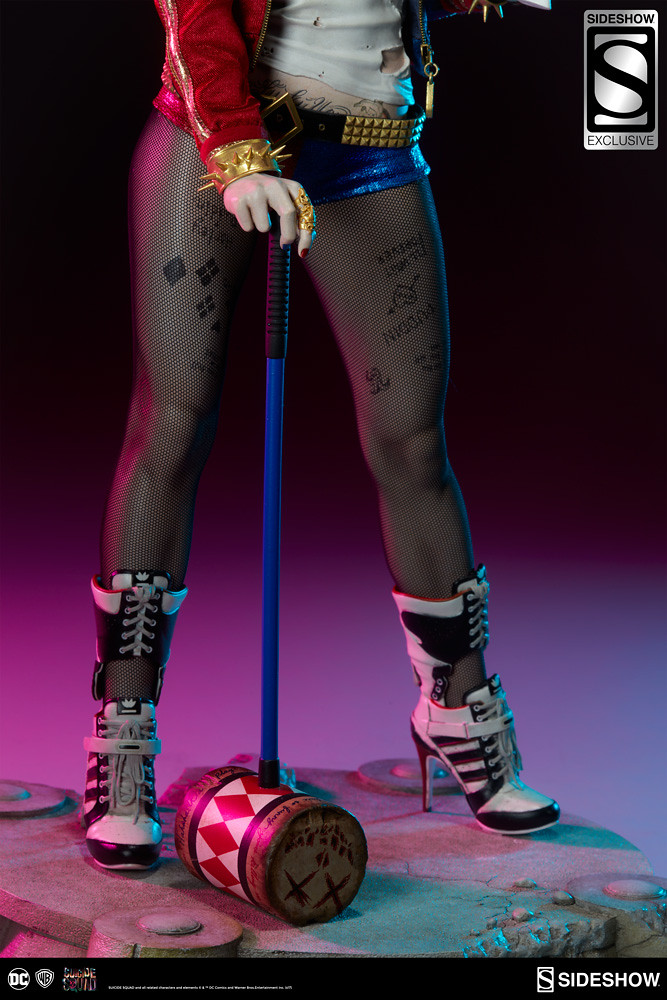這次Sideshow 推出的小丑女完整重現電影中的樣貌,全身上下都散發著妖豔的魅力,除了華麗的招牌手槍、細緻球棒之外,有太多值得玩味的細節可以慢慢觀賞!「PUDDING」字樣的項鍊、字母「J」的外套拉鍊、短到不行的小熱褲、性感的刺青等等都超級勾人啊~蒼白、脫妝的臉龐更是精彩,值得一提的是Sideshow 限定版附有「木槌」可以替換,如此高水準的小丑女收藏非常值得入手啊!