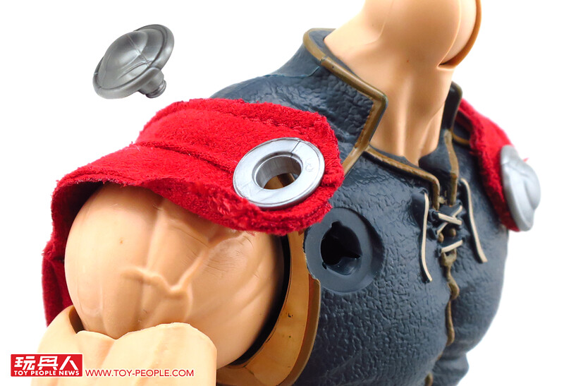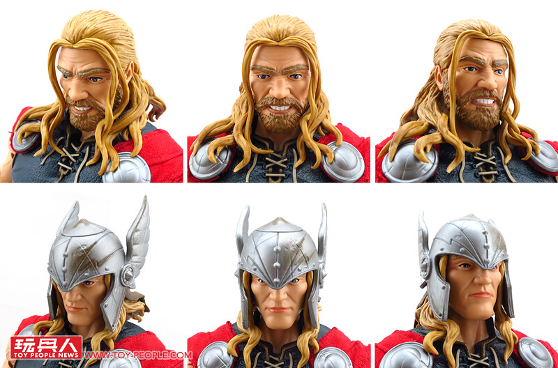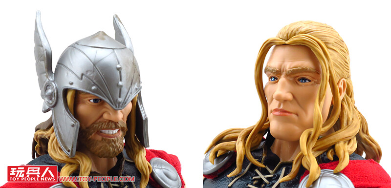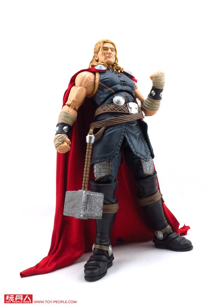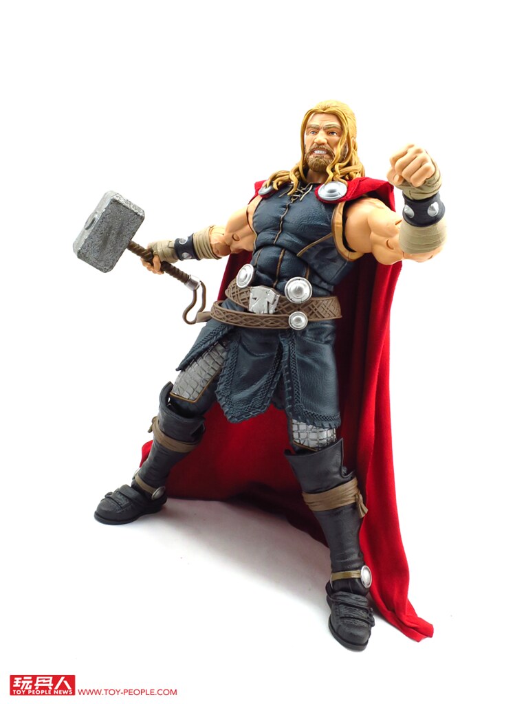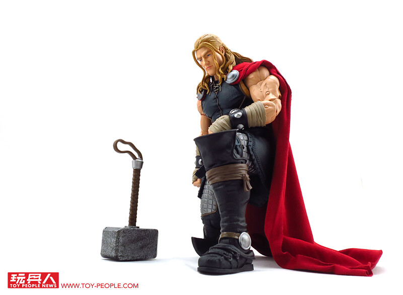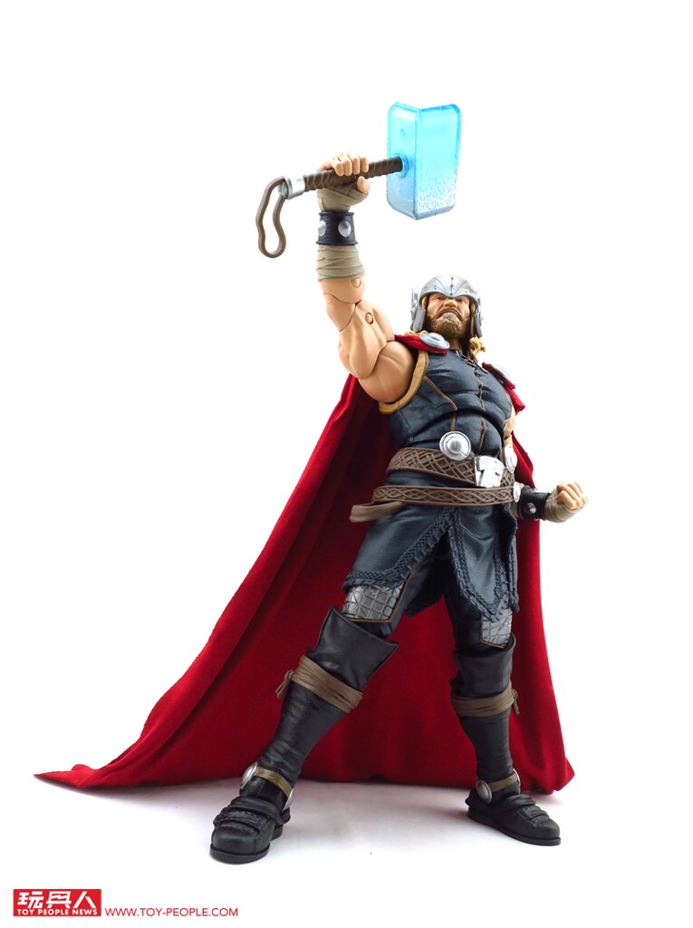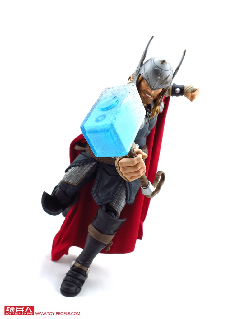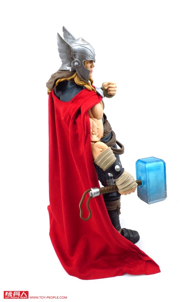 除了堪稱是基本配備的超可動關節外,這款12吋索爾更附屬了漫畫版本的雙頭雕,並可經由零件的交換重現戴盔或是長髮飄逸的樣貌,而招牌的武器-雷神之鎚「妙爾尼爾」(Mjölnir),則一舉收錄了金屬色的一般狀態版,以及半透明的放電版本,不僅如此,索爾背後的紅色披風更是罕見地採用了柔軟的絨布材質,而且其圍裙也是用皮材質呈現特殊混合質感,可說是本系列截至目前材質混搭最奢華的一款,其體型相對去年發表的鋼鐵人與美國隊長更顯得壯碩許多,熱愛漫畫造型索爾的玩具人,千萬別錯過這款超級經典的雷神囉!