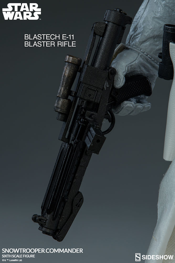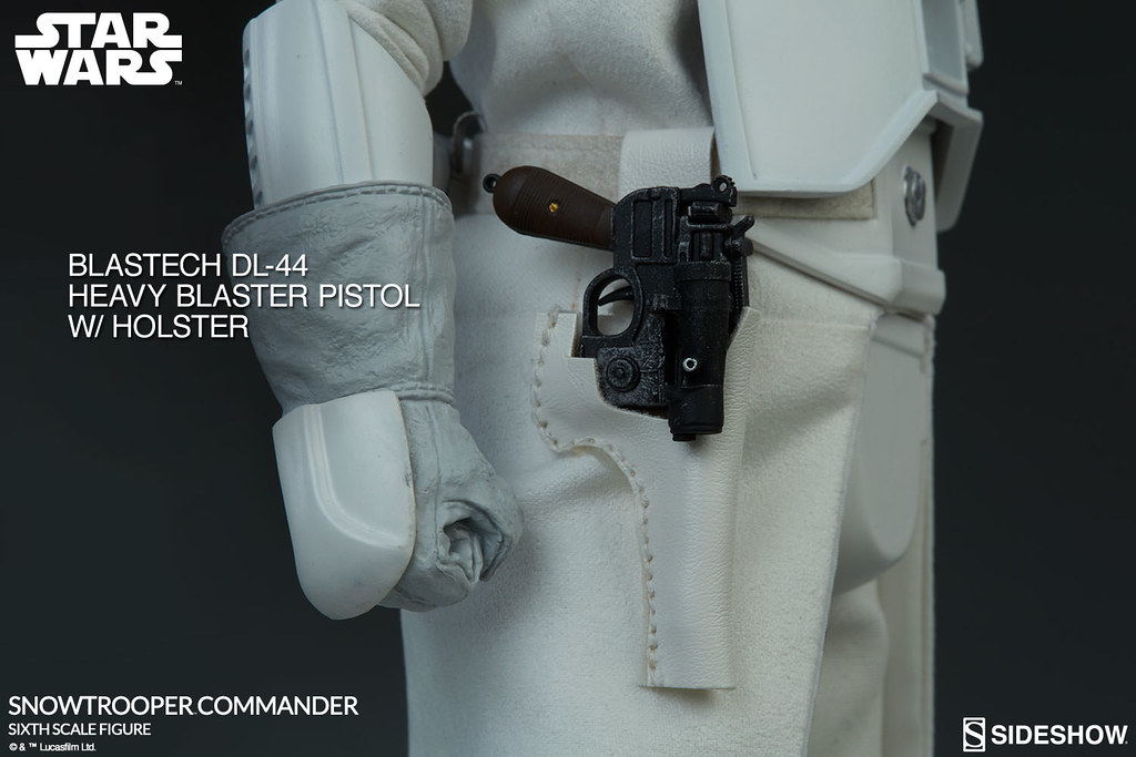 而這次Sideshow 在其1/6 比例系列推出「雪地指揮官」的作品,是繼2012 年推出「雪地兵」(Snowtrooper)作品之後,終於推出了他們的指揮官啦!在武器配件的部分,除了附上標準配備的E-11 blaster rifle 之外,更附上了一把可放置在槍套內的DL-44 heavy blaster pistol。有收藏其他帝國軍角色的玩具人可不要錯過啦!