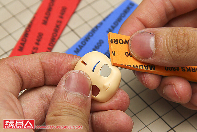 ▼ 接下來像這種弧面的結構非常推薦使用海綿式砂紙研磨,可以讓砂紙服貼零件才不會磨出角度。我們依序用400號、600號、800號將零件磨到細緻。