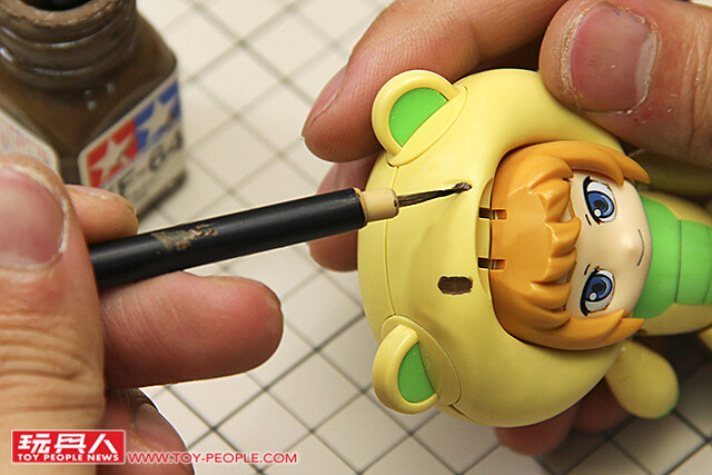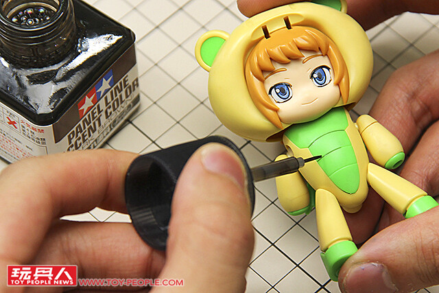 ▼ 接下來就可以上墨線啦,這裡使用的是深棕墨線液。遇到暖色系的零件,建議可以用棕色或深棕色來塗裝。