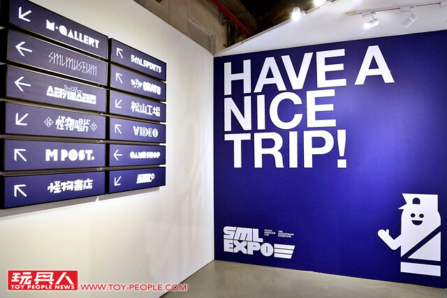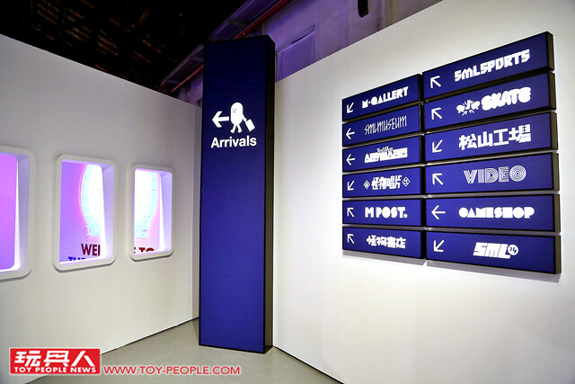 ▼ 終於來到了「M-city」的入境處了!「SML EXPO」以機場複雜的方位指示標誌的概念,來呈現這次M-city 不同商店的位置。由牆上的標示可以發現,M-city 裡面有M.GALLERY(怪物藝廊)、SML MUSEUM(怪物博物館)、SML SPORTS(怪物運動用品店)、SKATE(怪物滑板店)、M POST.(怪物郵局)、怪物唱片、怪物書店、怪物錄影帶店、松山工場、怪物超級市場與怪物Café 以及SML24(怪物便利商店)等等。
