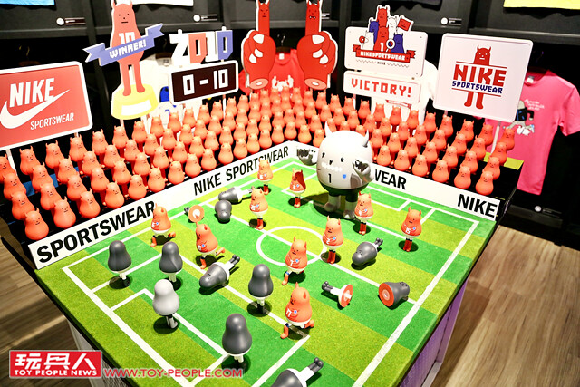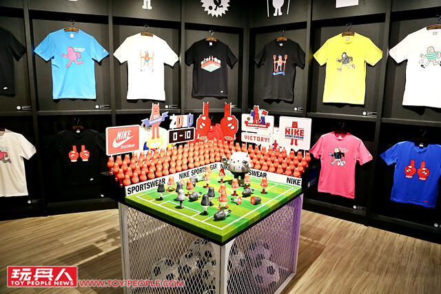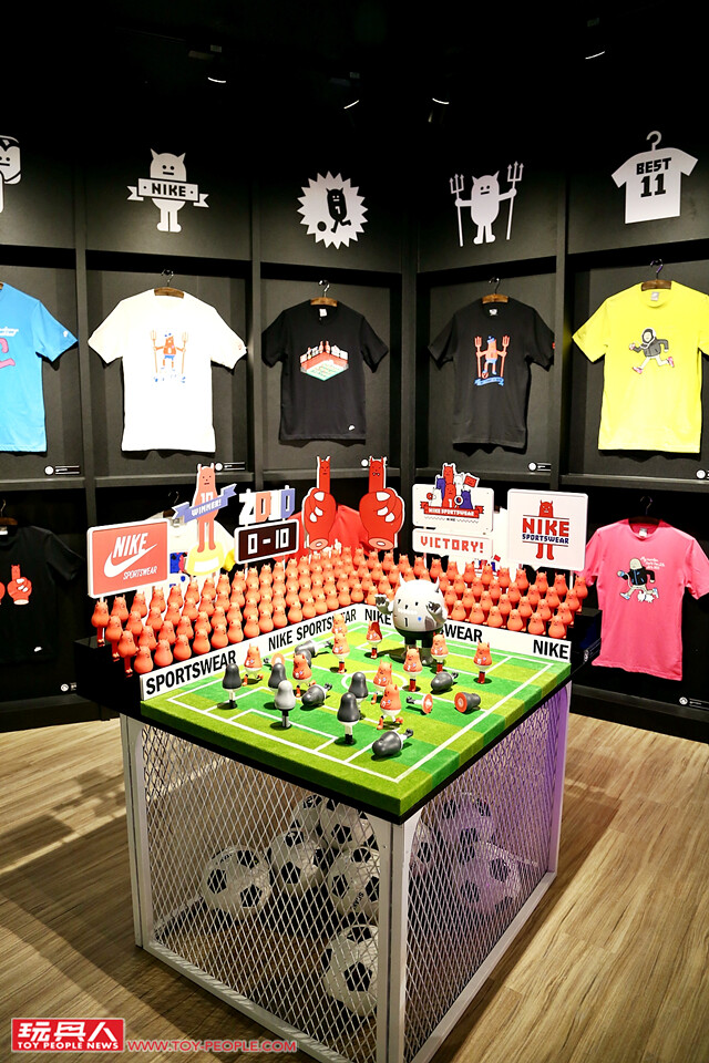 ▼ 來到了「怪物運動用品店」,沒想到知名運動品牌NIKE 的觸角竟然延伸到了神秘的怪物星球Magnox?!整間的怪物運動用品店掛滿了從2009 年開始Sticky Monster Lab 與NIKE 合作的T-shirt,並在店鋪中間的位置,將超可愛的怪物足球賽場景逼真呈現!(逼逼,怪物黑隊的守門員犯規!!)
