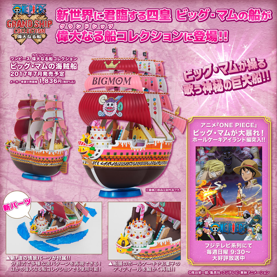 日本知名玩具品牌BANDAI 公司旗下「偉大的海賊船」(ワンピース 偉大なる船コレクション)蒐藏模型系列,繼之前介紹的「黃金梅莉號 回憶配色版」後,「BIG MOM 海賊船」也將在2017年7月登場!