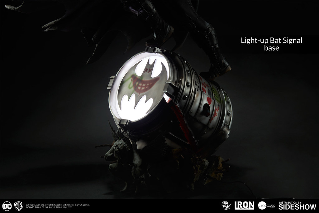 Ivan Reis 將蝙蝠俠與小丑的特色同時注入本作,矗立於探照燈上的蝙蝠俠手握鉤爪槍、蝙蝠飛鏢,儼然就是高譚市夜晚的守護者啊!全黑的蝙蝠戰衣使得胸前的標誌、棕色腰帶都十分搶眼,手工塗裝、細節的雕刻處理都相當精緻,配件部分有兩種頭雕,分別是角度朝上和朝下,也有兩種嘴型可以更換,還有握拳等等替換手更增添收藏價值。