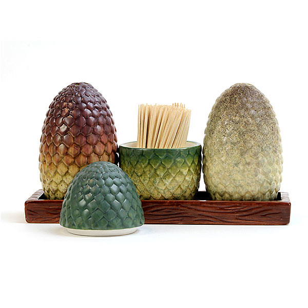 繼上次的「龍蛋餅乾罐」後,這次ThinkGeek 推出的龍蛋高約8 公分,將劇中那神秘的龍鱗完整重現,三種顏色讓你一次收齊,兩個是調味料罐、一個是能放牙籤、或是小木叉的蛋型收納罐,還附有木紋的陶瓷托盤方便擺放,不怕滾來滾去,真的是款實用又新潮的生活用品;最後小編有個溫馨的提醒:畢竟龍后只有一個也已經誕生,所以請不要輕易把龍蛋丟進火堆裡,並且嘗試徒手拿起來喔:D