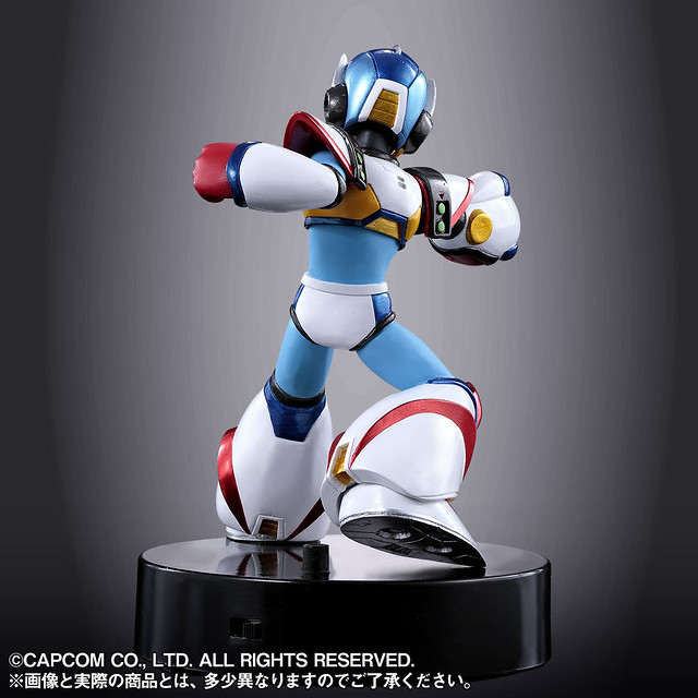 「艾克斯 第二裝甲」雕像在裝甲上使用大量的金屬色塗裝產生了厚重的質感,額頭的寶石則透過透明零件呈現。手砲部份內藏了兩色LED燈,能夠重現「雙重集氣射擊」擊出的瞬間!搭配動感十足的姿勢超熱血啊!如果不想開著燈展示,附件中也有一般展示用的手臂零件可替換。