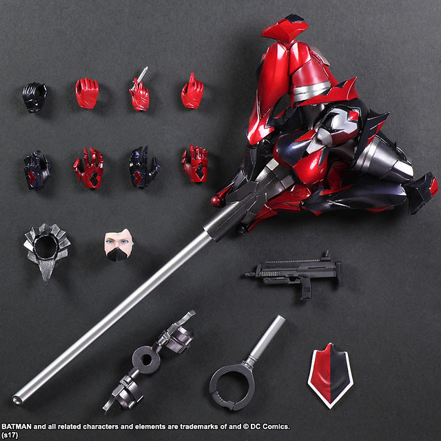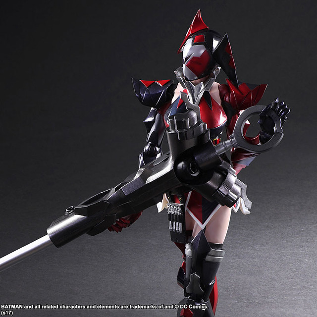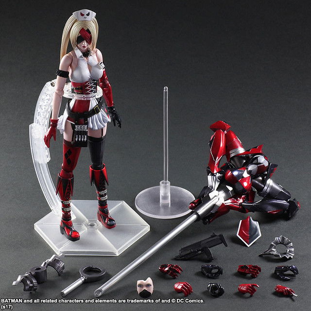 這款「變體版 哈莉·奎茵」與上一彈「小丑」相同,是由SQEX旗下知名的遊戲總監、角色設計師「野村哲也」所設計,讓哈莉·奎茵穿上紅黑色調的護士服,帶有性感迷人卻又危險的氣息,不但有著名牌、腰帶上的針筒等細膩設計,護士帽上還有張壞壞的笑臉!她的武器除了衝鋒槍外,還有一把大的驚人的巨鎚。
