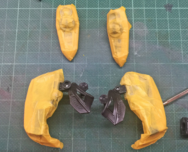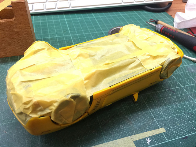 接下來就是遮蔽,全部噴上金屬漆,大概分成兩種顏色的金屬底漆,槍鐵黑跟金屬黑。