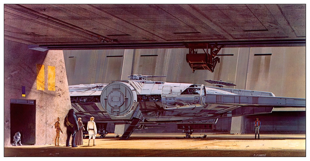 ▼ 由星際大戰知名的藝術家Ralph Mcquarrie 所繪製,《星際大戰四部曲:曙光乍現》中千年鷹號停泊於塔圖印 Mos Eisley 太空港 Docking Bay 94 的原概念設計圖