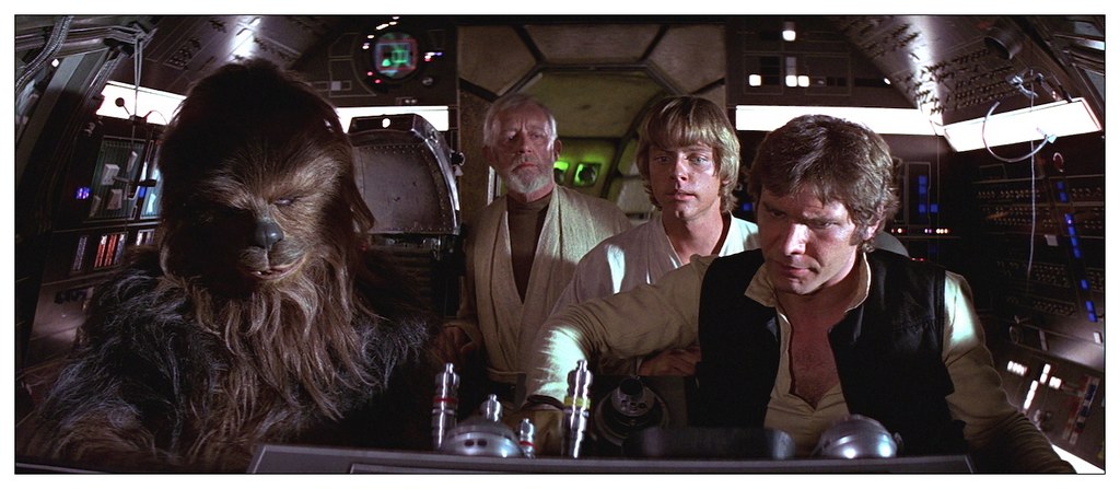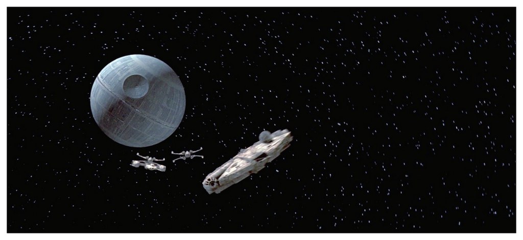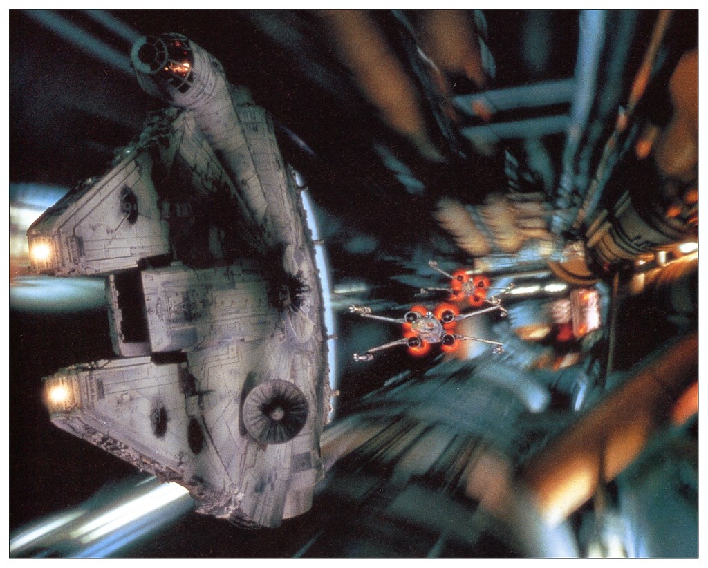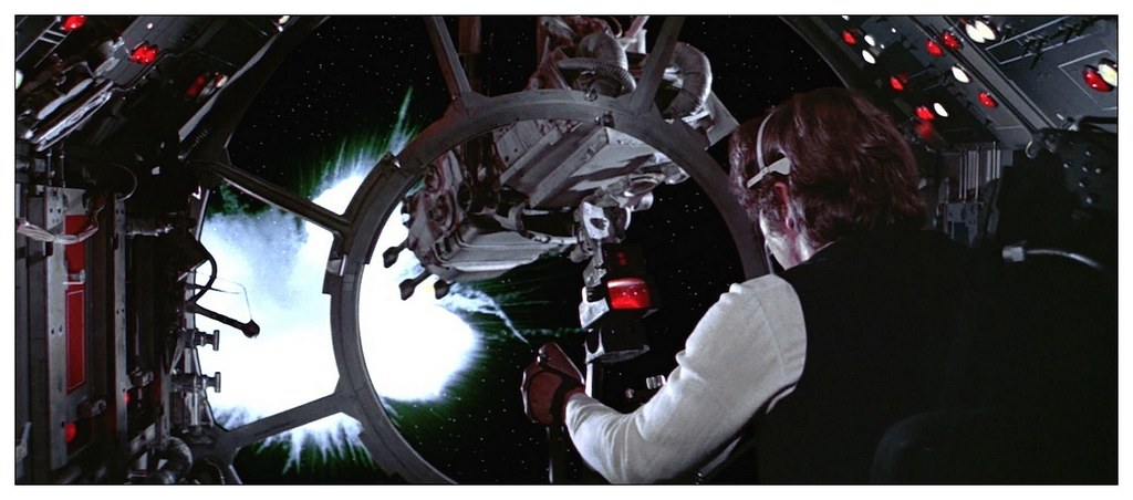 ▼ 在《曙光乍現》中叛軍攻擊死星的關鍵時刻,韓索羅駕駛千年鷹突然出現在黑武士的鈦戰機上空並使其偏離航道,從而幫助路克的X翼戰機 成功擊中死星主反應爐。